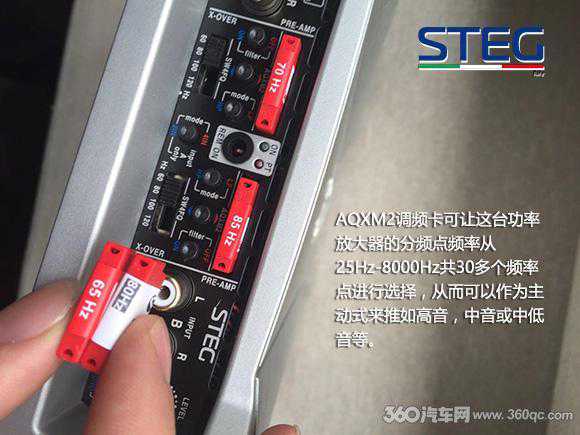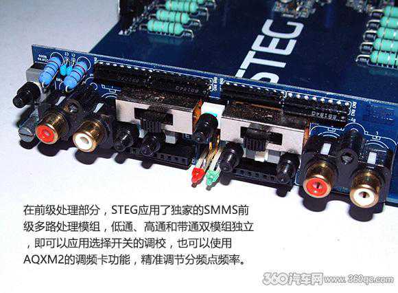 为了达到更好的音质表现,在信号处理电路上,STEG以简约直通的前级信号处理与放大为主。为了有更好的声音表现,在前级处理部分,STEG应用了独家的SMMS前级多路处理模组,低通、高通和带通双模组独立,即可以应用选择开关的调校,也可以使用AQXM2的调频卡功能,精准调节分频点频率。