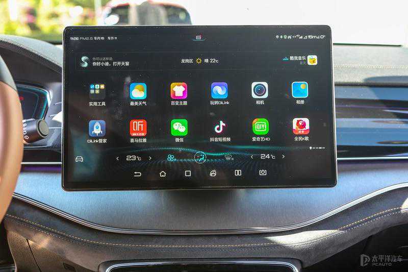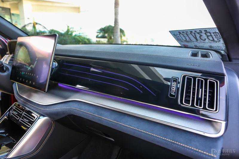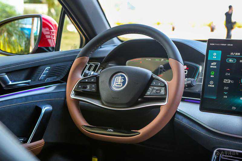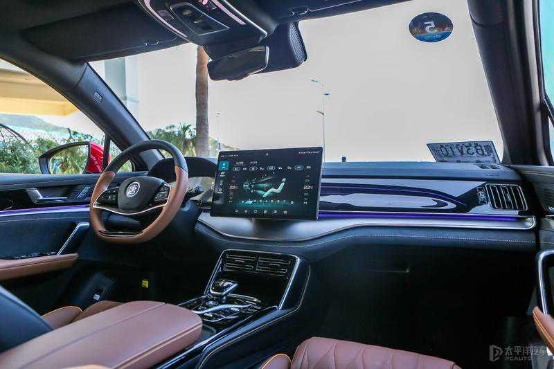 中控台用上了一大块亮黑的饰板装饰,内部还加入了会呼吸的氛围灯,再搭配中间这块大屏幕,科技感的营造上新款唐EV做得很到位。