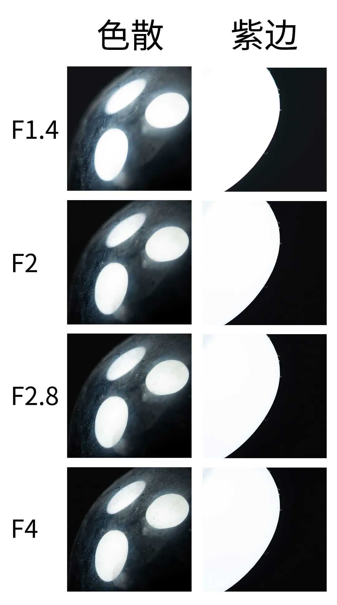 在最大光圈时,灯泡高光与暗部交界处有非常轻微的紫边现象,但几乎只在100%放大时仔细观察才能察觉。缩小光圈至时,紫边已不可见。
