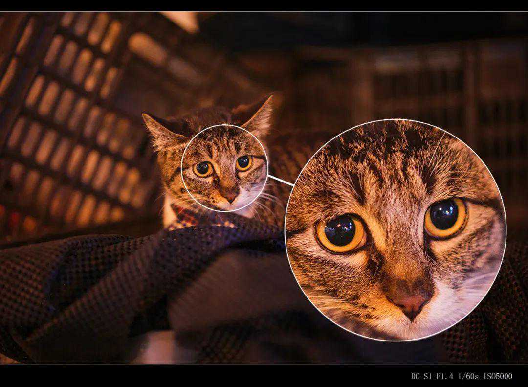 从漆黑环境中拍摄的猫咪可见,该镜头暗光下虽不算超快,但准确性很高,也不会拉风箱。而且时中心画质就非常锐利,小猫脸部毛发清晰。同时前景的网布与背景的篮子虚化效果自然,没有出现可见二线性。