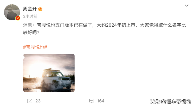 [懂车帝原创产品]日前,上汽通用五菱品牌事业部副总经理周钘在其个人社交媒体表示,宝骏悦也五门版车型预计会在2024年初上市,并且向用户发起了征名活动,或许意味着该车将不会沿用当前悦也的命名。目前在售的宝骏悦也为三门版,共2款车型在售,售价分别为7.98万元和8.98万元。
