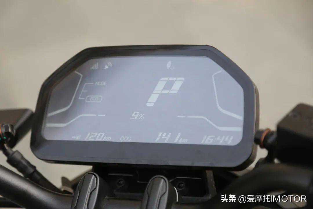 很多同级的燃油车仪表都没这么大的显示区域,每个信息都有很宽裕的展示空间,像模式切换、时速、电量等信息一应俱全,甚至能直接显示剩余骑行里程,还有来电提醒功能,而且U-GOGT配备了边撑感应功能,侧撑打开时也会有一个醒目的车辆图标显示在仪表的最上方,而且此时车辆也无法启动,保证安全性。不过这块屏幕在强光下反光还是较为明显,夜间表现佳。