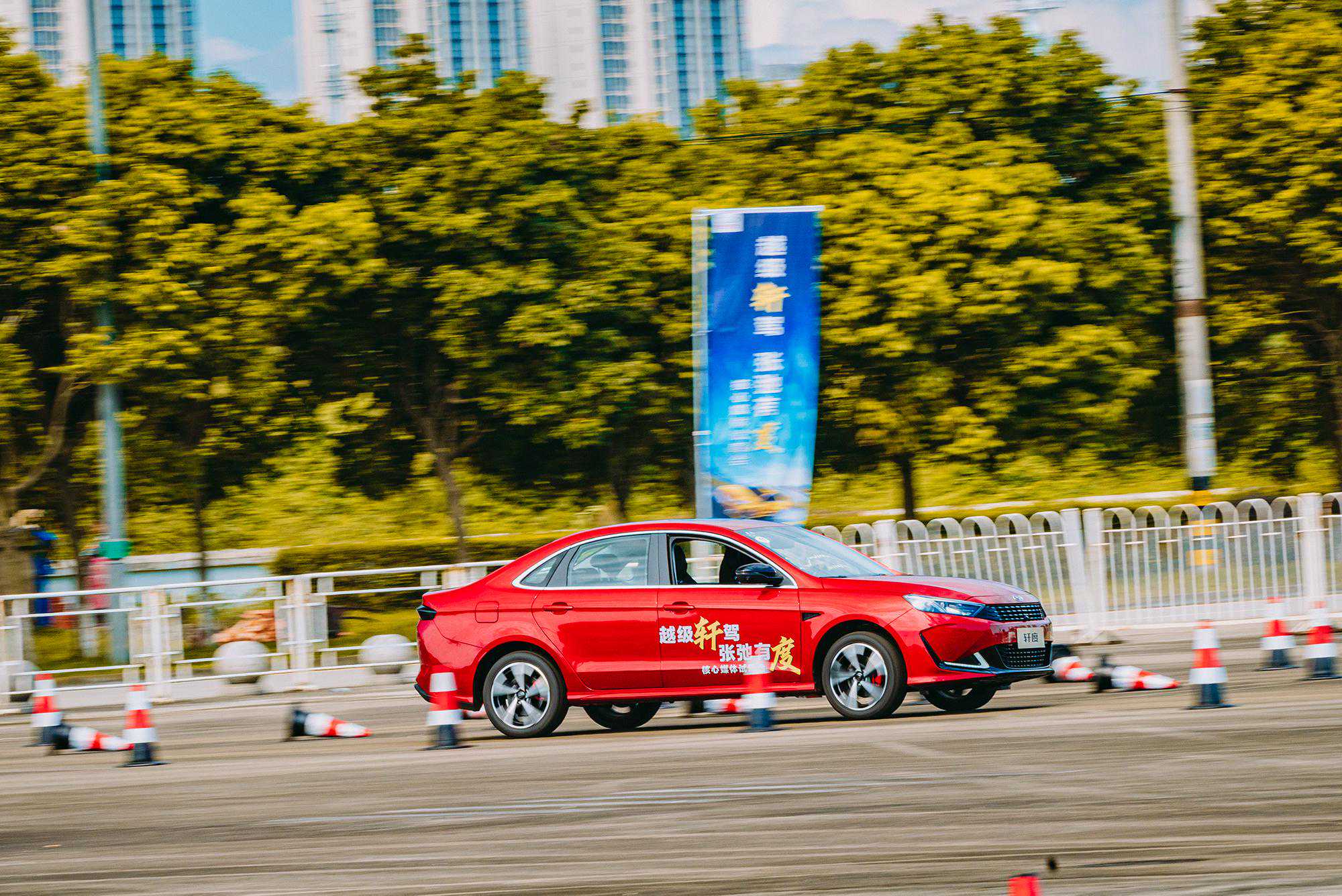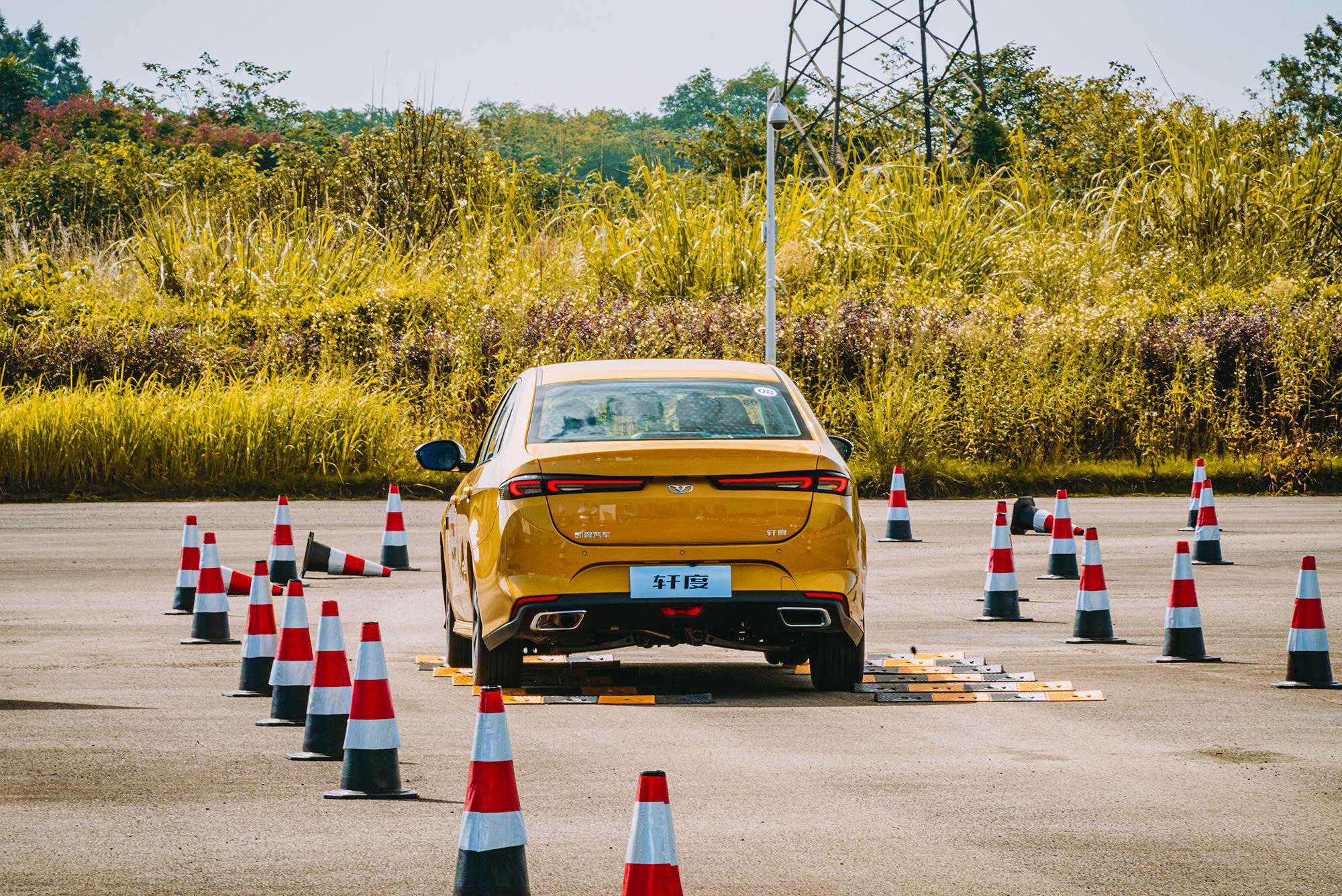 当然,轩度也是属于具有“运动感”的家轿,比如经过减速带区域,车身的整体感可圈可点,不会显得过于生硬,底盘的胶套用料显然要比传统轿车更厚实。另外,方向盘的指向性也还可以,但是转向圈速较大、经常需要换手,在场地试驾中还是能发现到较大的转向比拖累了这台车的灵活性。