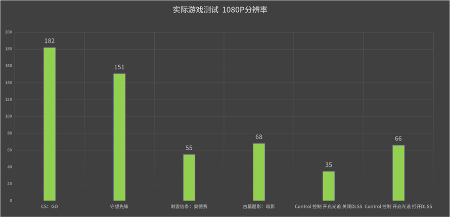 因此,经过我们的测试,在1080P的分辨率中,包括《CS:GO》和《守望先锋》这两款主流的电竞游戏其性能都可以超过144帧,其中《CS:GO》更是超过了180帧,可以说完全发挥了144Hz的电竞屏的实力,而在两款3A大作中,《刺客信条:奥德赛》的平均帧率为55帧,而《古墓丽影:暗影》的帧率为68帧,至于《Control》开启DLSS与否对于性能的影响相差比较大。