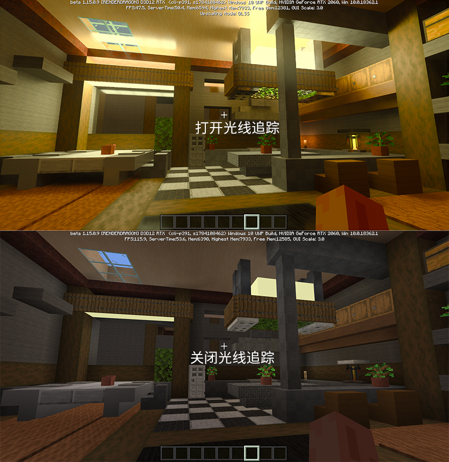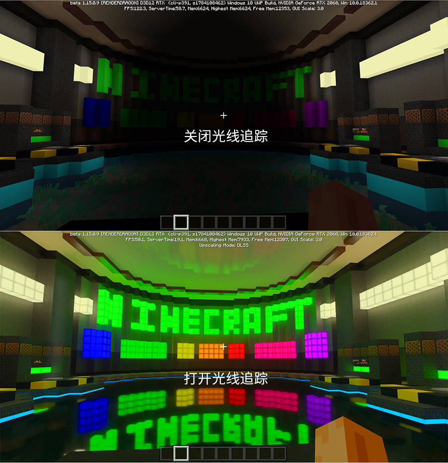 英伟达在20系显卡中加入了光线追踪功能,能够给玩家带来接近于真实世界的光线,在《我的世界》这样的游戏中,光线追踪对于游戏画质的加成可以说相当地巨大。通过上述两张图片的对比,我们可以看到打开光线追踪与关闭光线追踪完全就是两款不同的游戏,在显卡性能可以承受的情况下,自然是打开光线追踪来追求更加真实的游戏画面。