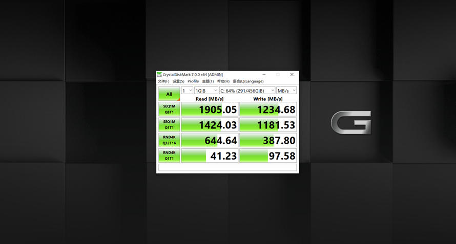 而在磁盘测试中,经过CrystalDiskMark的跑分,戴尔G55500所采用的NVMeSSD读取速度为1.9GB/s,写入速度为1.23GB/s,还是相当地给力。