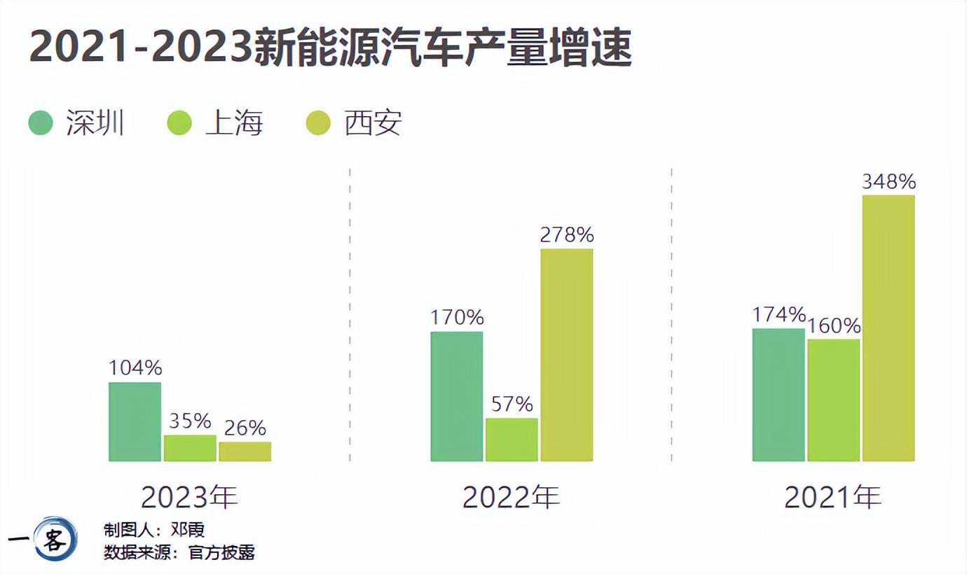 2023年,尽管深圳官方并未披露具体数据,但根据已公布的104.2%的增速,以及2022年的87.47万辆产量测算,其新能源汽车全年产量约为178.12万辆,远超西安(98.38万辆)和上海(129万辆)。