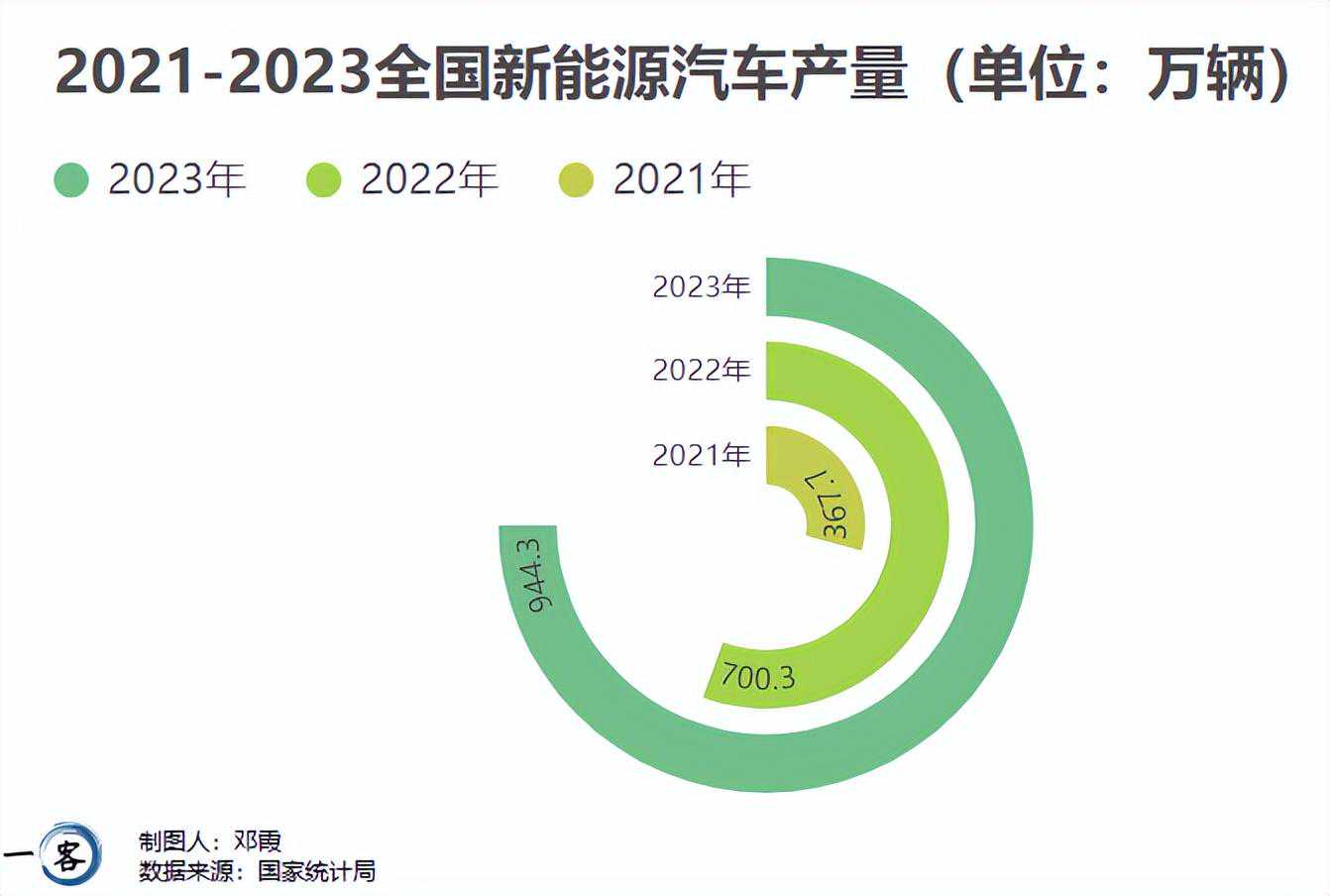 此后三年,中国新能源汽车产业开始加速奔跑。2021年到2023年,中国新能源汽车年产量从367.7万辆迅速扩大到944.3万辆。据国家统计局局长康义介绍,2023年,中国新能源汽车比上年增长30.3%,产销量都是世界第一。