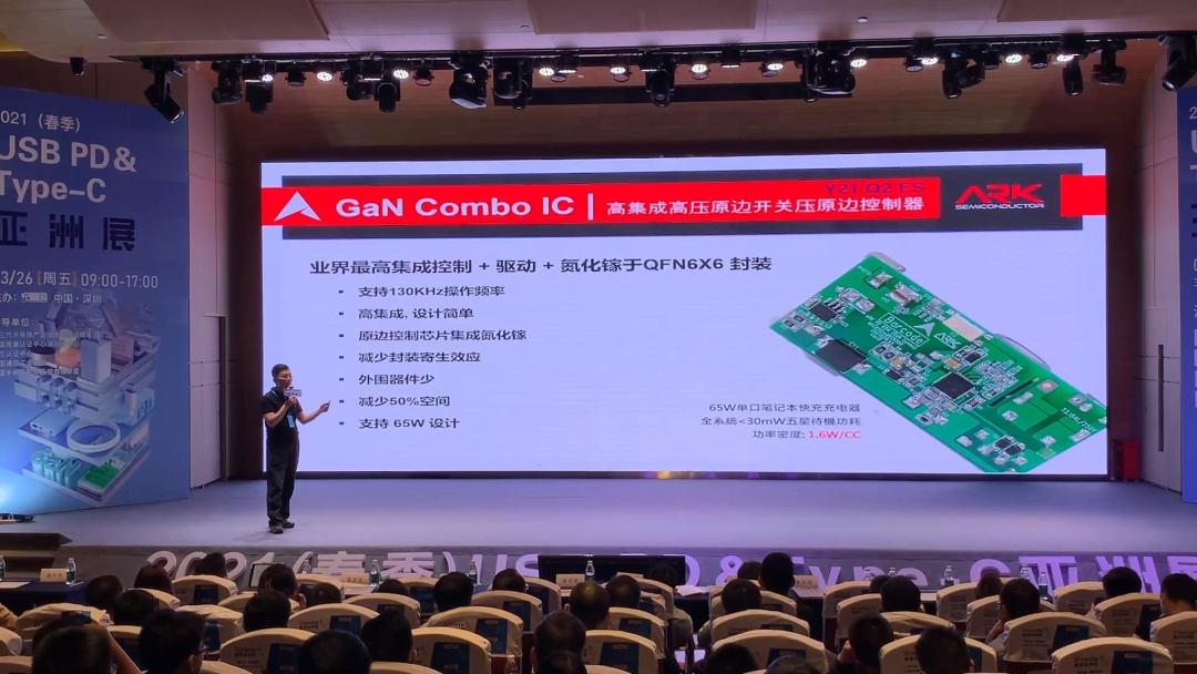 针对氮化镓快充市场,艾科微「2021(春季)USBPDType-C亚洲展」上发布了一款高集成高压原边控制芯片,其集成控制器、驱动器和氮化镓功率管,外围器件少设计简单,相对于传统方案设计而言,可减少50%空间。