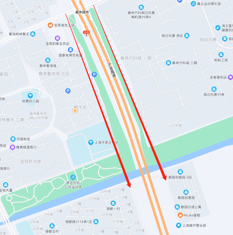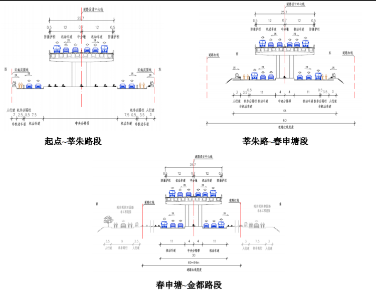 起点~春申塘段辅道机动车道两侧布设人非车道;春申塘~金都路段辅道设置机动车道,人非交通工程利用田园路都园路实现。各路段因匝道和工程形式设置略有不同。