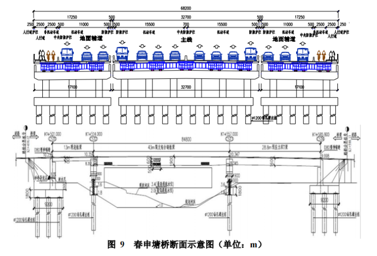 根据道路总体方案及春申塘通航需求,本次对现状春申塘桥拆除重建,先在现有春申塘桥两侧新建辅道桥,拆除现状春申塘桥后,再新建中间两幅桥。