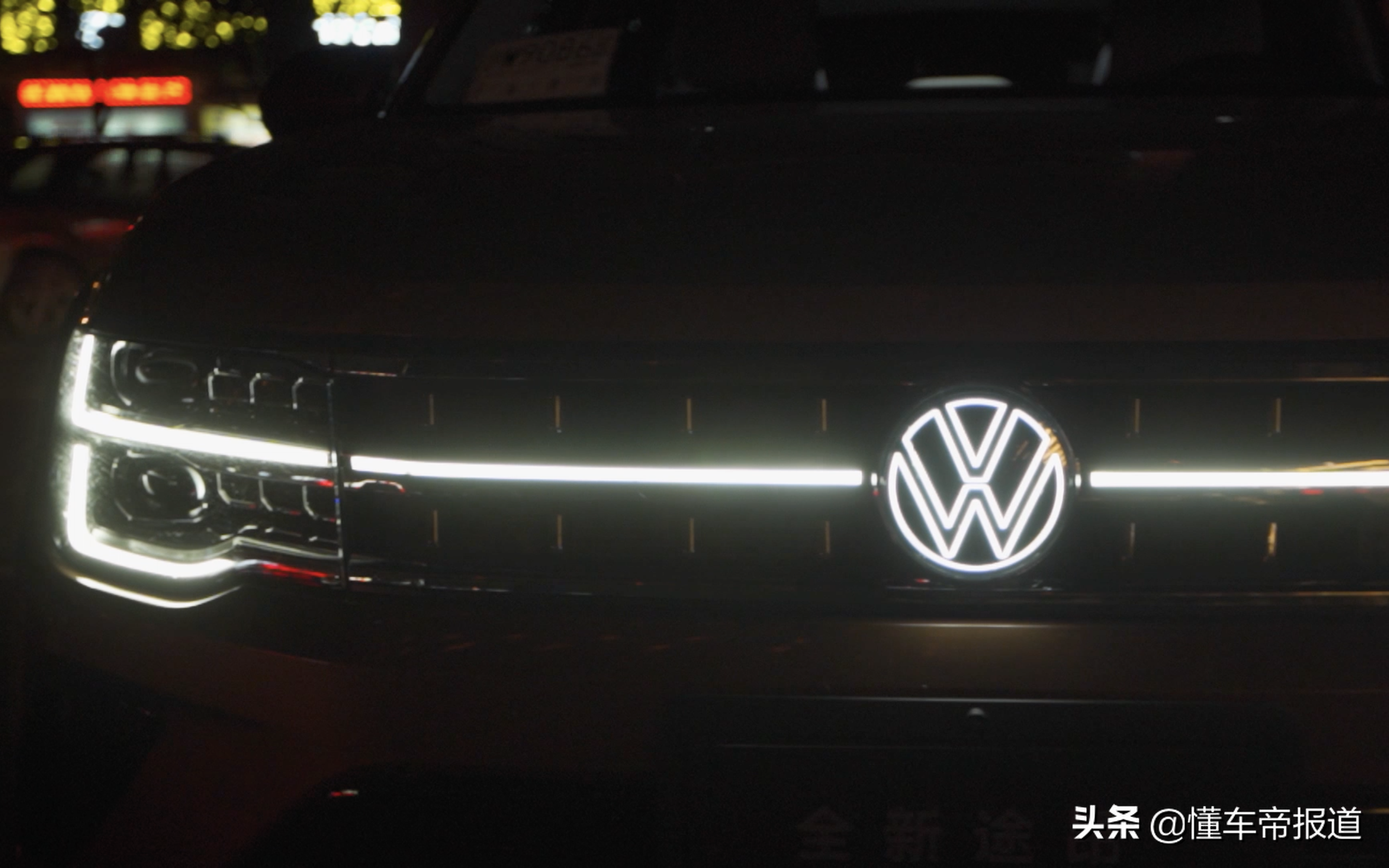 日行灯贯穿车标,车标点亮后让途昂的夜间辨识度大大提升。