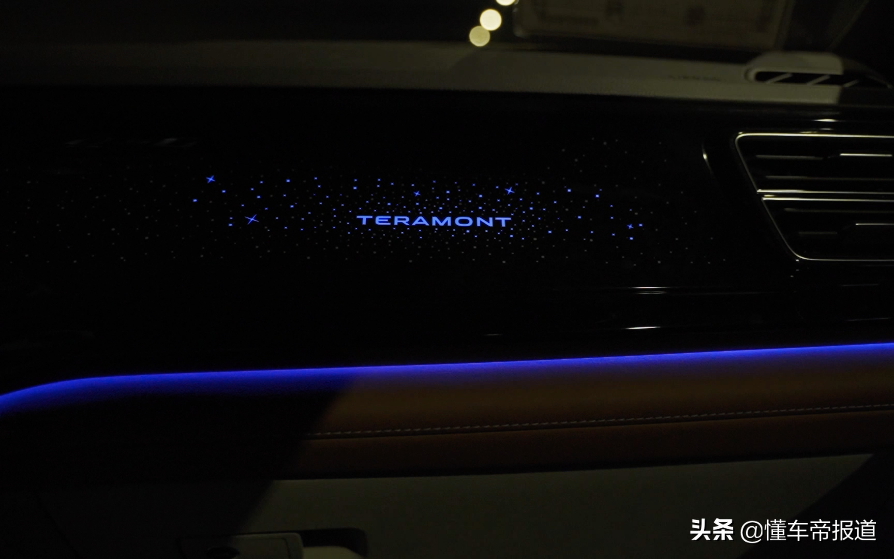 全新途昂除了贯穿式日行灯,车标外还增加了不少“发光部位”,例如投射到地面的迎宾灯,以及内饰部分的“满天星”效果。