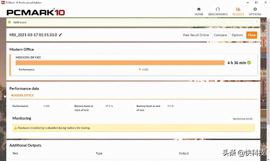 冲锋坦克2GL65电池为51Wh,在超级电量模式下,50%亮度的续航为4小时36分钟,符合游戏本的基本预期。