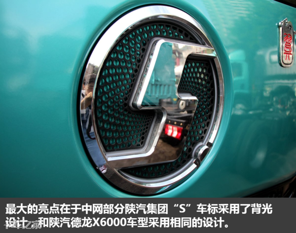车辆型号和品牌标识等都位于中网部分,最大的亮点在于中网部分陕汽集团“S”车标采用了背光设计,和陕汽德龙X6000车型采用相同的设计,夜间开启之后不仅可以提高车辆的辨识度,而且还可以收获超高的回头率。