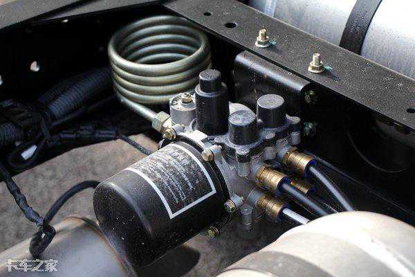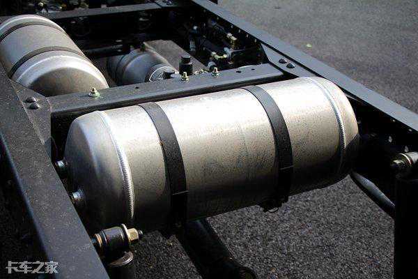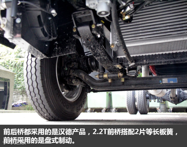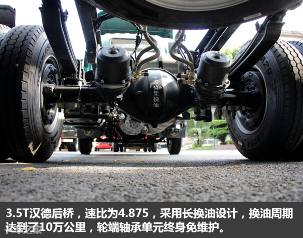 后桥为3.5T汉德后桥,速比为4.875,采用长换油设计,换油周期达到了10万公里,后桥轮端轴承单元终身免维护,可以减少日常保养的次数和费用,省下来的时间也可以多赚钱,结构上采用的是外置式制动鼓和轻量化设计,方便日常维修,还可以降低车身自重。