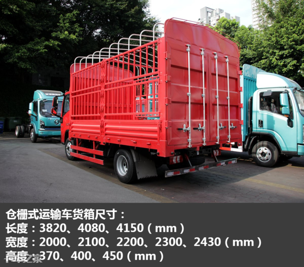 货厢尺寸方面,货厢长度可选3820mm、4080mm以及4150mm;宽度可选2000mm、2100mm、2200mm、2300mm、2430mm,不同上装货厢的高度有所不同,仓栅车和平板车的高度可选:370mm、400mm、450mm;厢式车的高度可选2000mm、2100mm、2200mm、2300mm。