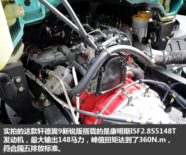 实拍的这款轩德翼9新锐版搭载的是康明斯发动机,最大输出148马力,峰值扭矩达到了360,符合国五排放标准。