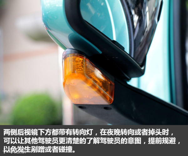 两侧后视镜下方都带有转向灯,在夜晚转向或者掉头时,可以让其他驾驶员更清楚的了解驾驶员的意图,提前规避,以免发生剐蹭或者碰撞,这个设计在国内其它轻卡中也比较少见。