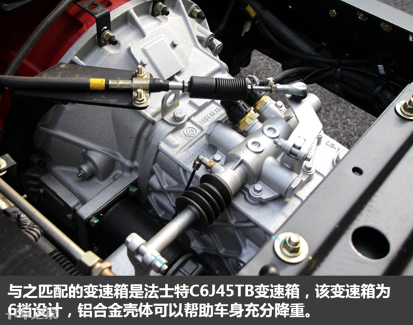 与之匹配的变速箱选用的是也是中重卡市场中的绝对霸主法士特变速箱,型号为C6J45TB,该变速箱为6挡设计,铝合金壳体可以帮助车身充分降重。