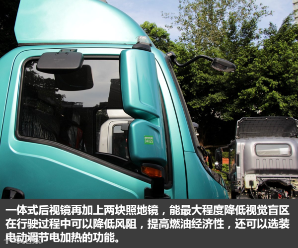 轩德翼9的后视镜也区别于其他品牌的轻卡,采用了和轩德翼系列重卡上相同的设计,一体式后视镜再加上两块照地镜,镜架看上去很结实,而且外摆镜两块镜面之间做了分隔,在行驶过程中可以降低风阻,提高燃油经济性,还可以选装电动调节电加热的功能。