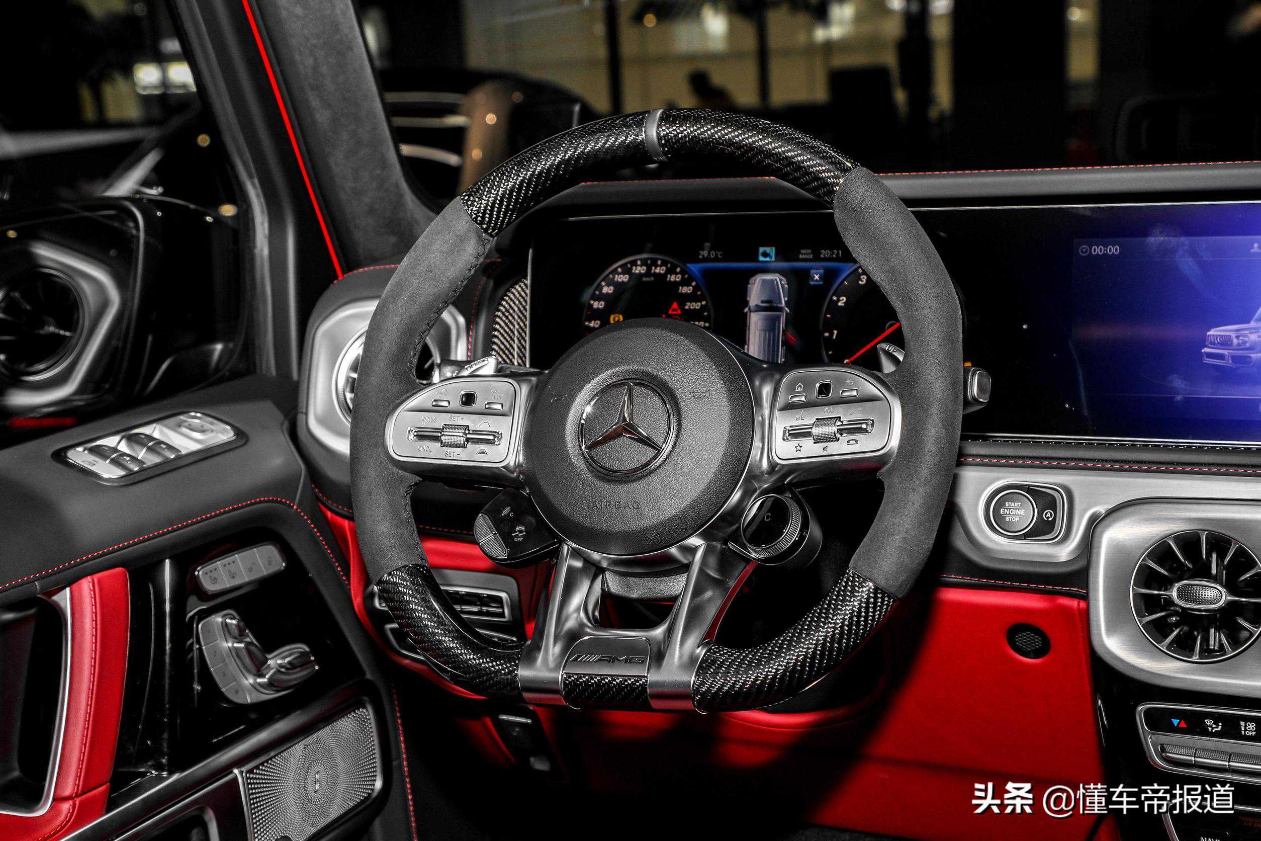 与外观配色风格类似,本次实拍车型内饰同样为红黑双色搭配。由于是一款AMG车型,该车还配备有AMG运动方向盘、碳纤维饰板、红色安全带等。对比2021款车型,2022款G63配置水平与之类似,仅是增加了部分选装项目,包括Alcantara材质包裹方向盘和方向盘加热。