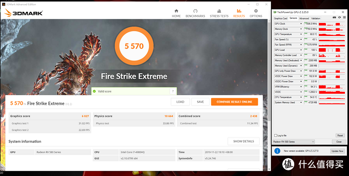 这张显卡本来就是RX570,只不过命好可以上RX580桌面版显卡的BIOS,所以不存在装驱动补丁的步骤,用起来方便一点,所以贵了¥40块钱。这¥40贵的值不值?大家看看测试数据自行分辨吧: