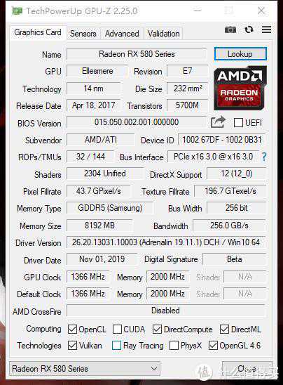 1306MHz的主频,在RX570界也算高的了,驱动版本19.11.1