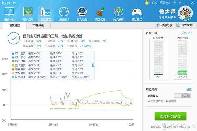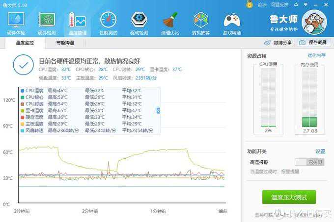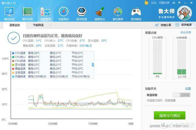 鲁大师性能测试之后的温度峰值表现(只要不超过75°C就算可以接受);