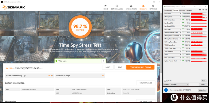 3Dmark20轮TimeSpy稳定性测试通过率98.7%。虽然没574高,但也算能接受了
