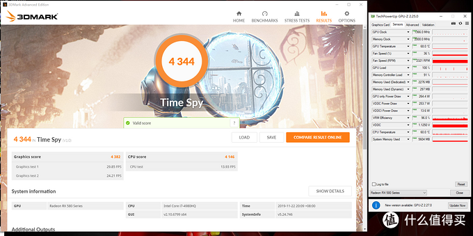 额好吧。即便是室温22°C的情况下,这个烤机温度表现,确实不错。¥309块钱买到这样体质和性能的RX570,装个驱动补丁也是可以接受的。然后,看看残血版RX580的表现如何吧: