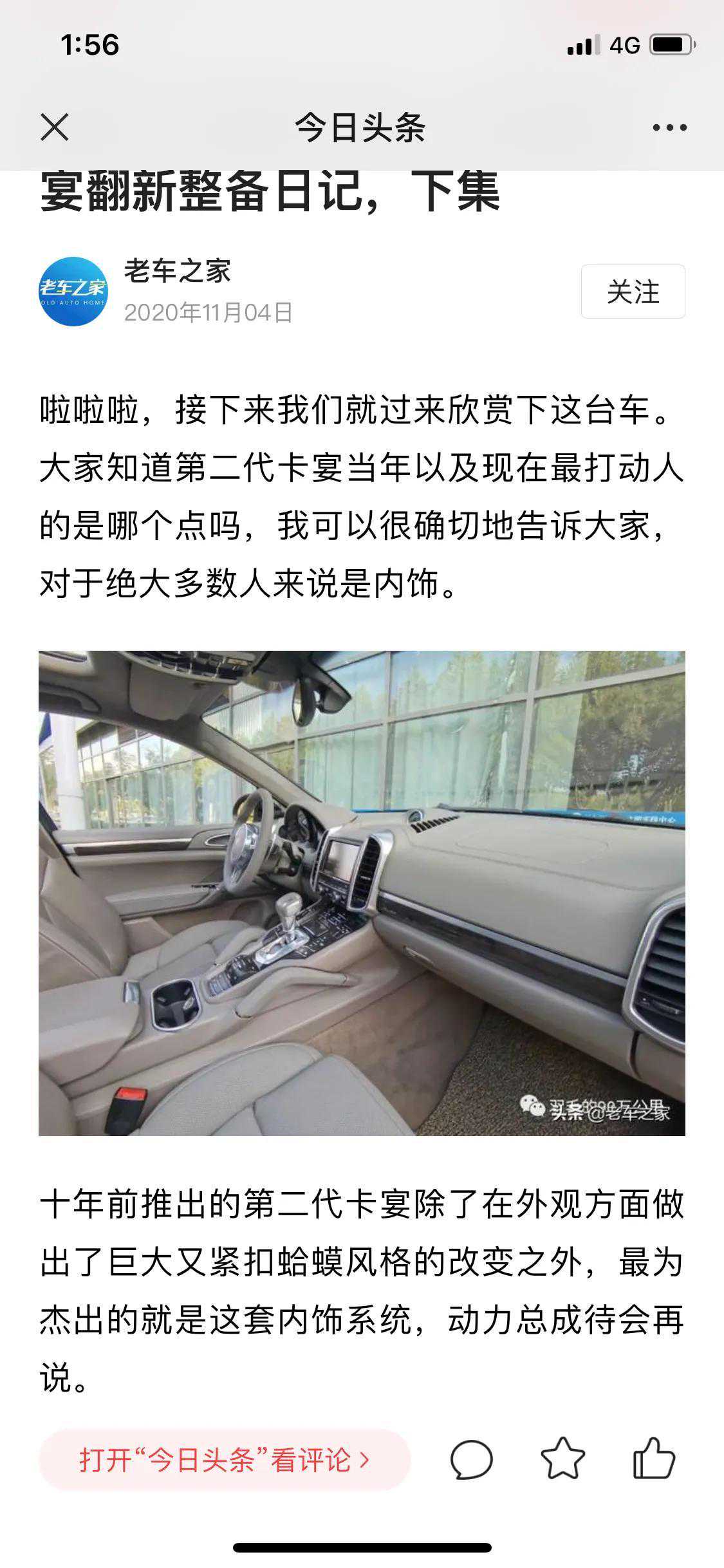 在回家的路上我仔细地体验驾驶感受:发动机运转平顺,噪音几乎听不到。原来偶尔敲缸的问题没有了,共震的问题也有很大的改善。底盘开起来异常的扎实,空气悬架能过滤掉百分之九十的颠簸。转向准确(保时捷的转向在suv里面是数一数二的)内饰件没有任何噪音。总的来说,我非常满意,有些细微的地方甚至比新车的时候还要好一点儿,可能是心理作用吧,看来厂长兄弟的技术还真是不错,而且真的真的用了心[赞][赞][赞]