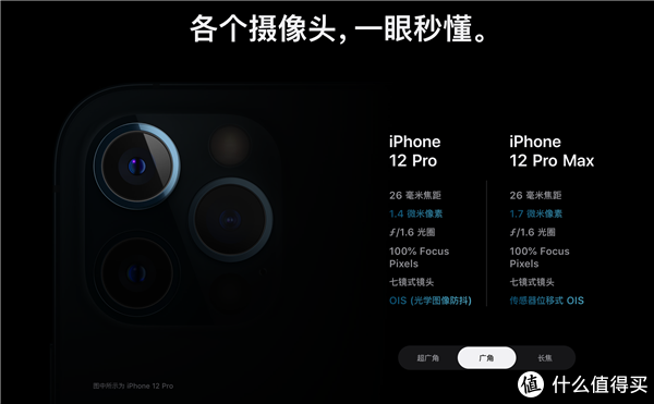 iPhone12Pro和iPhone12ProMax都后置全新的三摄系统,包括一颗视野宽广的超广角摄像头、一颗长焦摄像头,以及一颗新的广角摄像头,其中有两枚镜头在iPhone12ProMax上有更强配置,例如长焦镜头的焦段更窄,从52mm升级到了65mm,最高可以拍摄2.5倍光学变焦更长焦距影像作品。