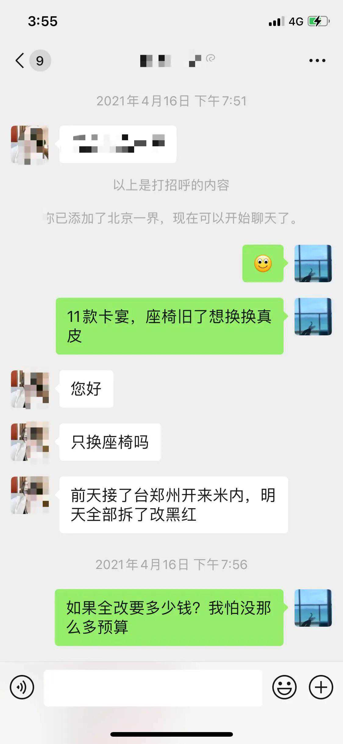 接下来就要选择包真皮的厂家了,厂长给我推荐了两个,一个是五方天雅的商户干了十几年,优势是价格。另一个是高端一点儿的,缺点是价格。我说你给我个微信吧我聊聊再说