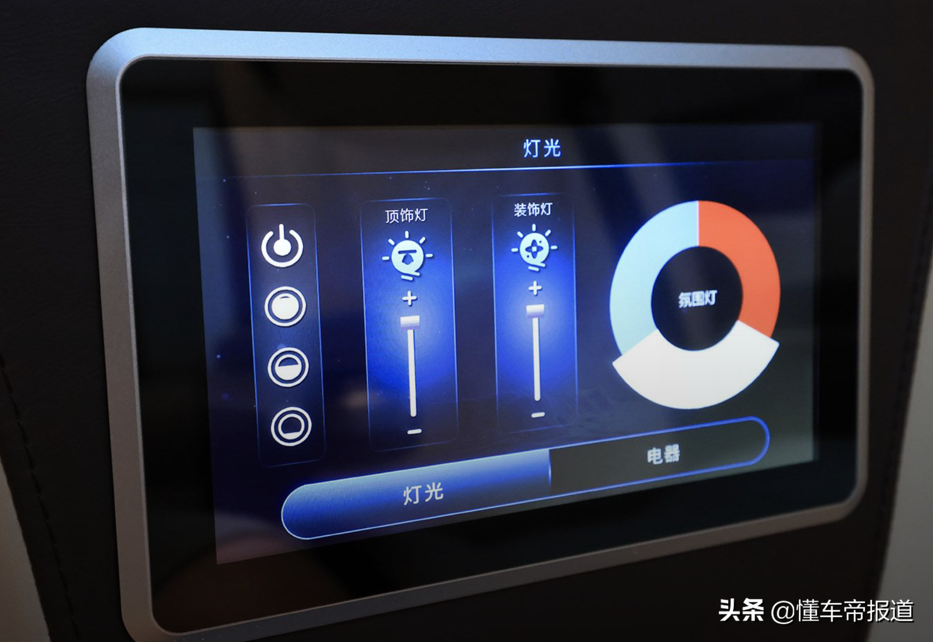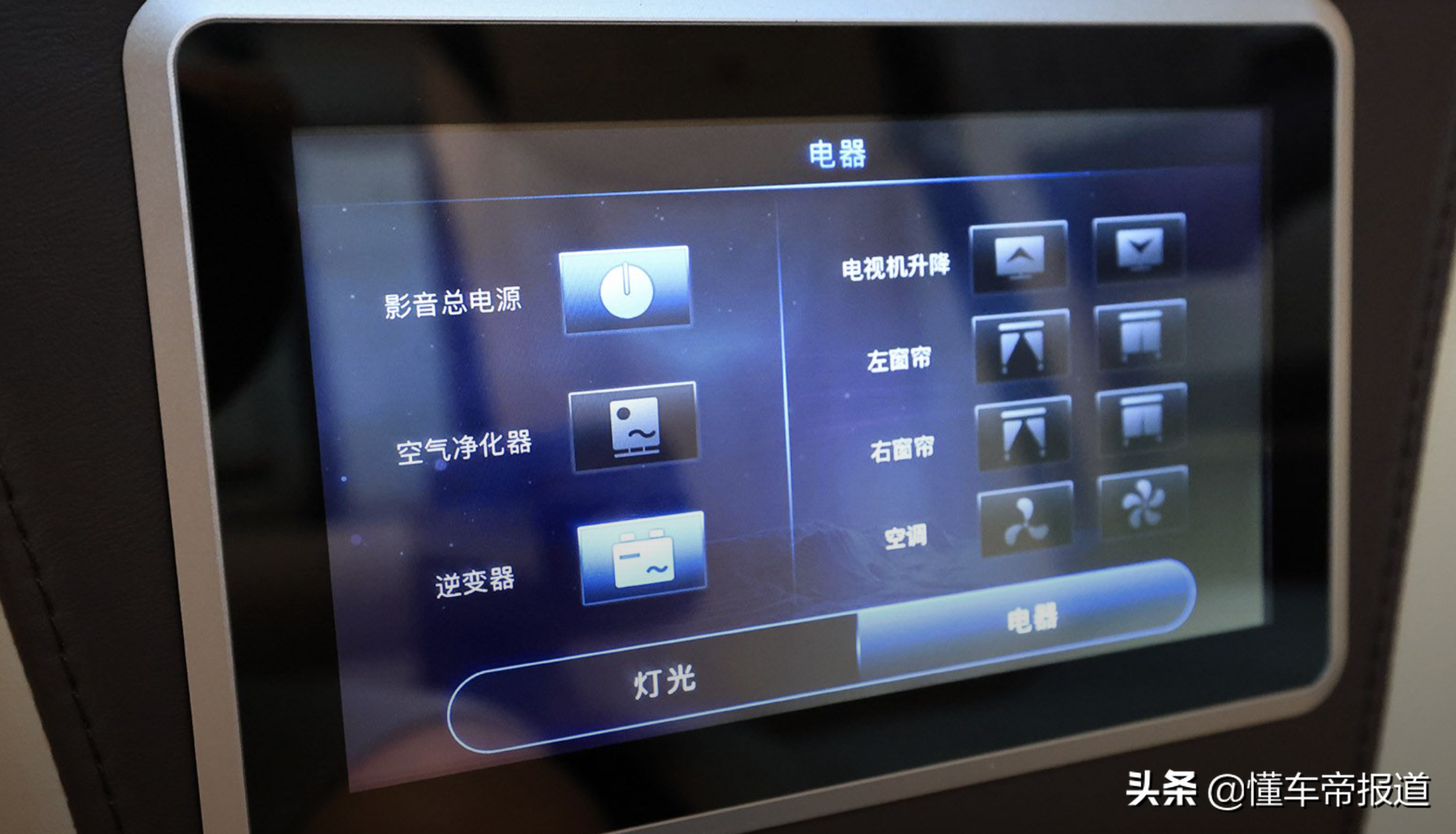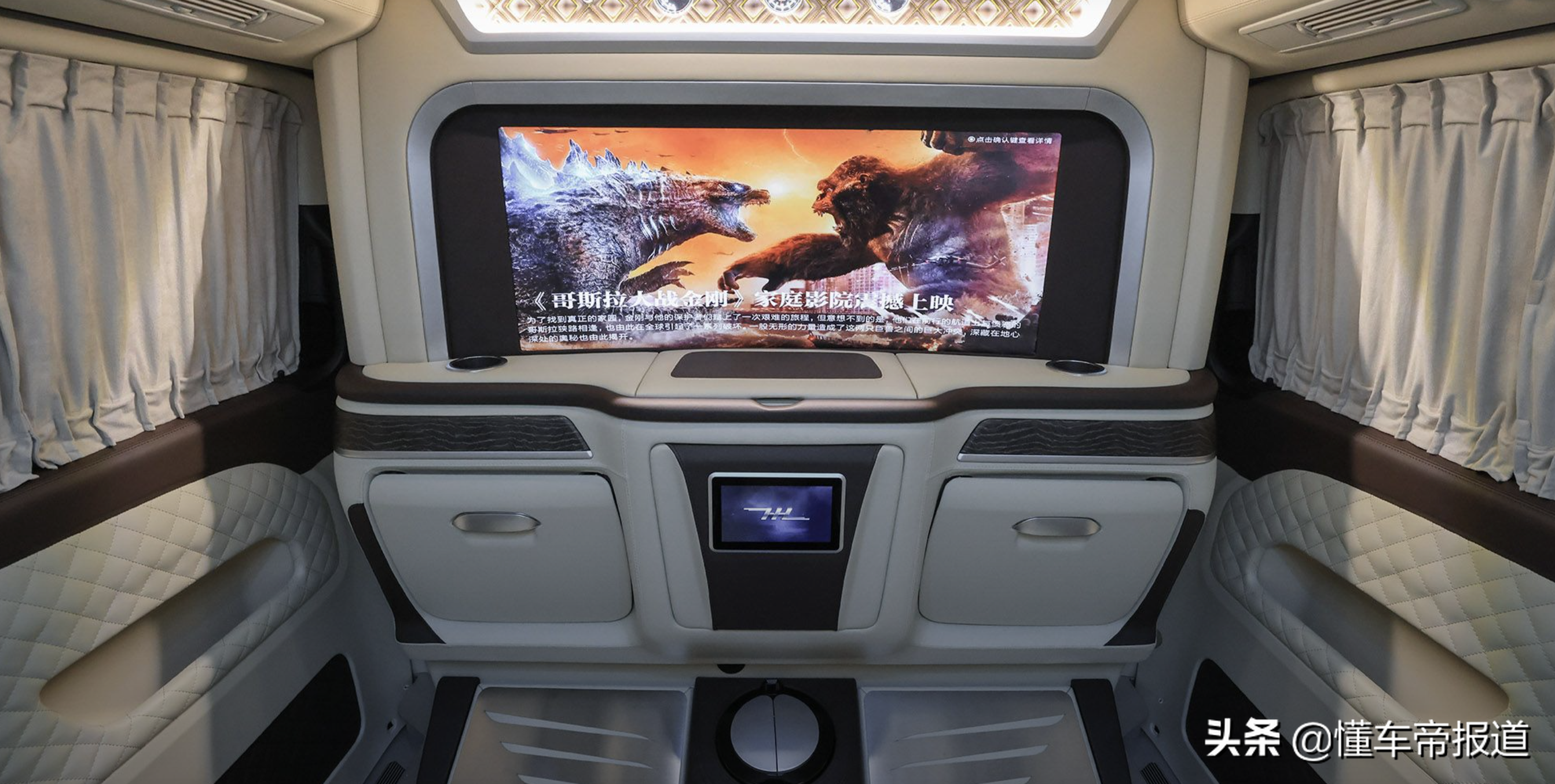 内饰方面,卡漠兹系列威霆车型内部采用2+2+3式7座布局,并在驾驶席与后排之间设计有隔断墙,该隔断墙集成有大尺寸显示屏。此外,该车在原厂威霆基础上采用精装修设计,包括第二排两个独立式航空座椅、第二排小桌板、车顶灯组、后部隐私帘、车内逆变器、空气净化器等。