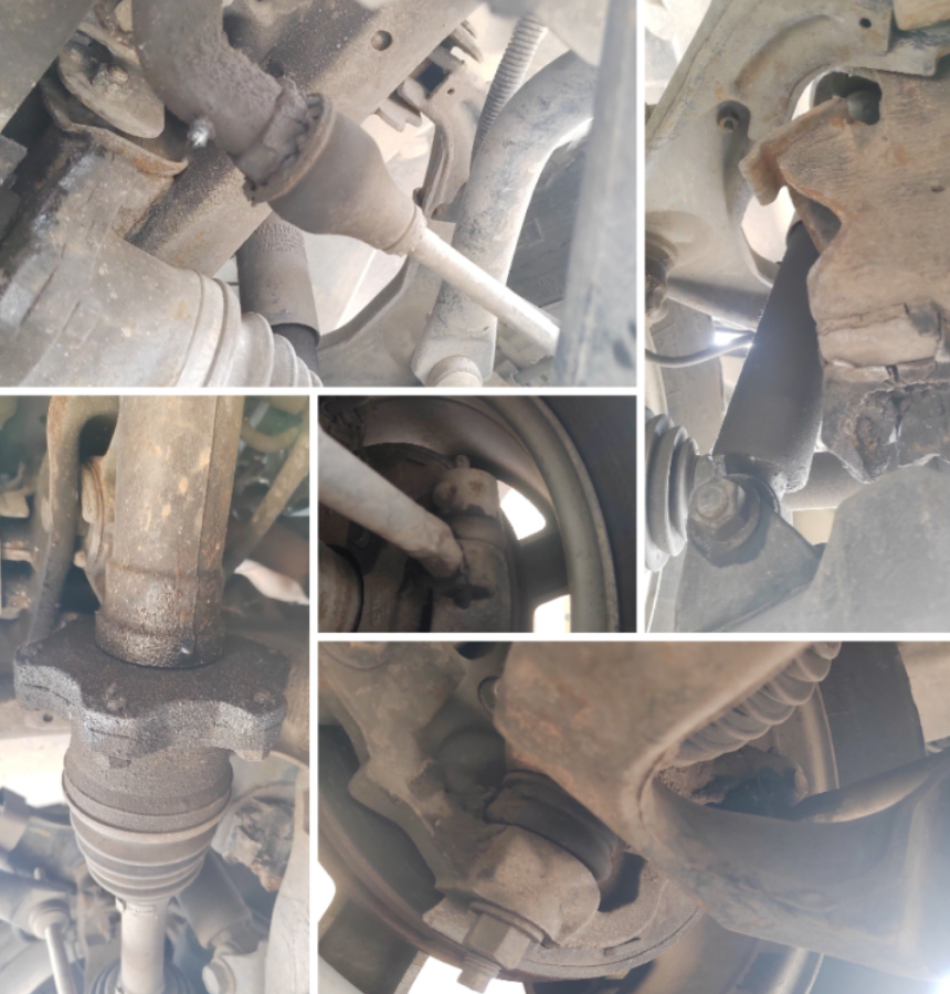 我们接下来看一下底盘,底盘连杆件全部老化破损,前面减震器也漏油了,半轴也漏油,时间长了这些东西都不行了。
