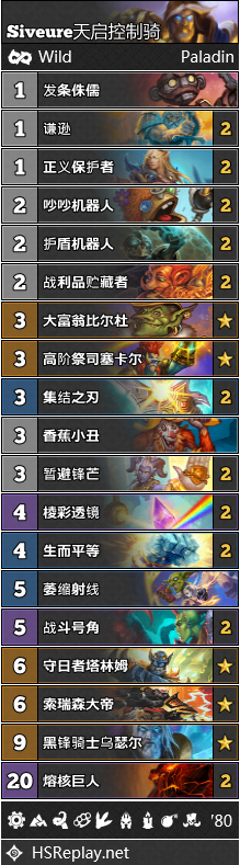 由于偶数萨的陨落,骑士从热度榜中游的位置上脱颖而出,成为了新一代的狂野三巨头之一。高阶祭司塞卡尔和熔核巨人的组合技可以先声夺人,而且根据这个月的情况来看,这一招只要能够打出,简直就是无往而不利。因此,所有能够携带这一组合技的骑士卡组都纷纷将其纳入麾下,这等于是为各种强力的骑士卡组增加了一种天胡的可能。就连死鱼骑都带上了塞卡尔+红石头来弥补前期场面的空缺,各种快攻型骑士更是一早便选择了真香。