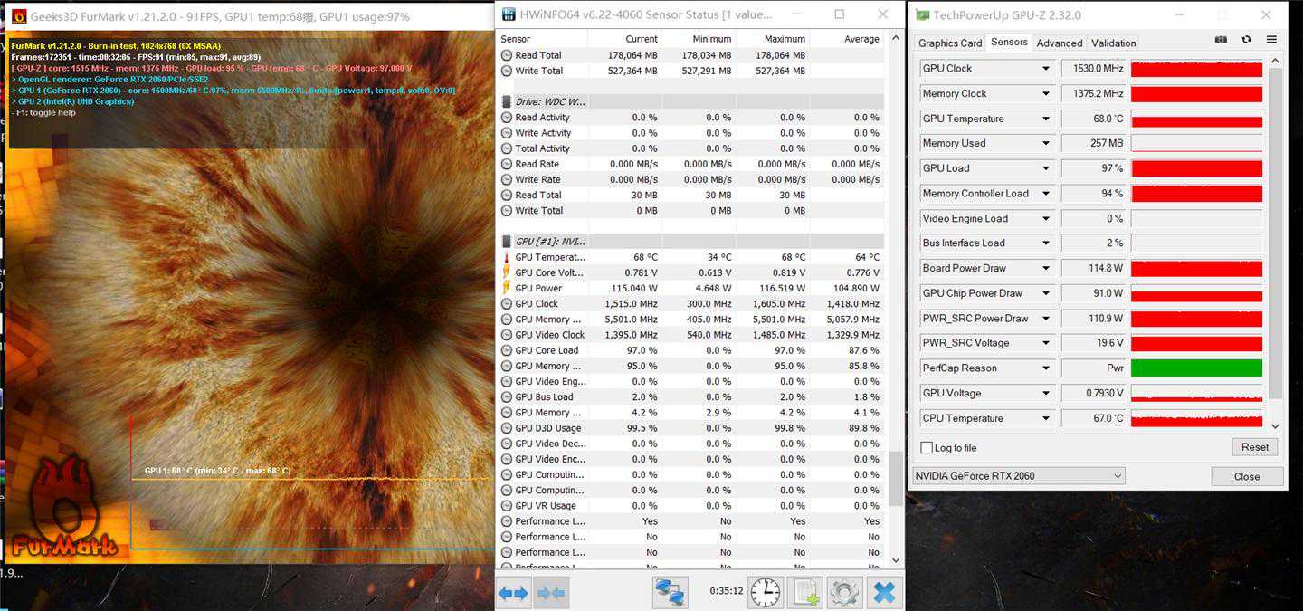 接着是单烤30分钟GPU,此时GPU温度为68度,GPU频率在1530Mhz,功耗为115W,在保证了115W满血输出的同时,温度控制在68度,可见冲锋坦克2GL65游戏本的散热效果还是不错的。