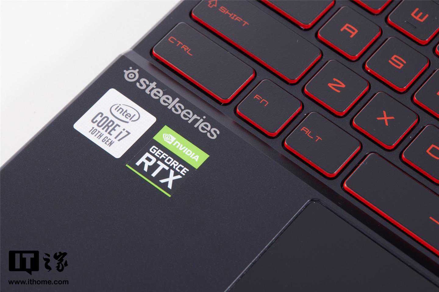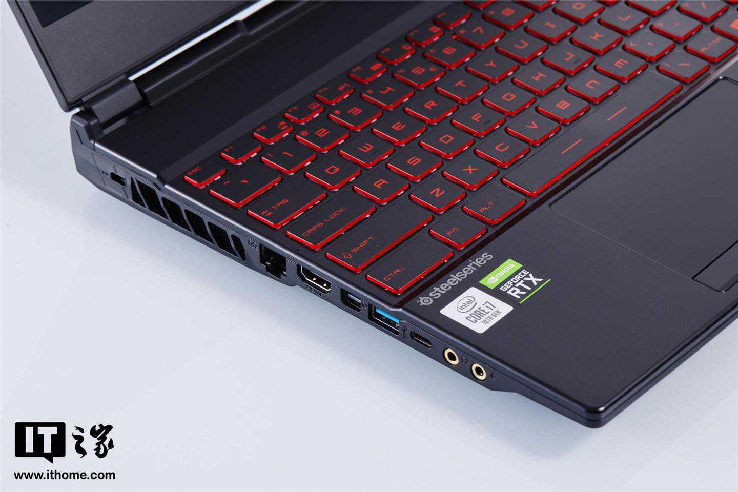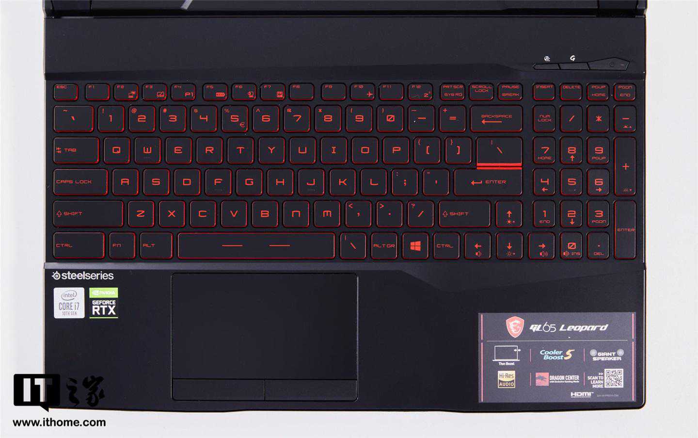 冲锋坦克2GL65的C面同样为磨砂工艺,键盘采用了红色背光,是传统游戏本的黑红设计风格,并且还预留了数字小键盘,点赞。值得一提的是,冲锋坦克2GL65搭载的还是赛睿红色背光电竞键盘,键盘键程较长,手感偏软,更适合游戏玩家。