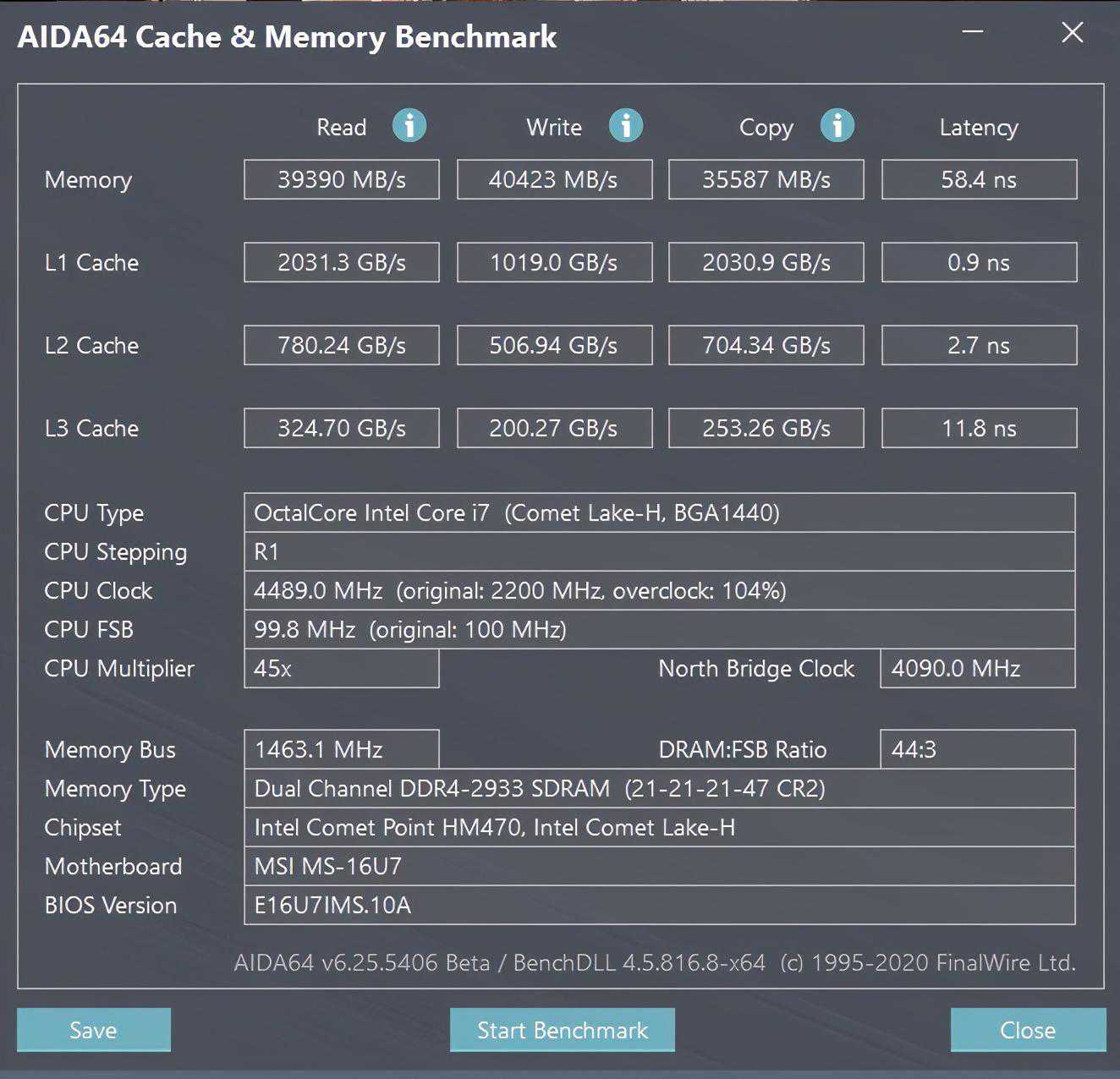 内存测试环节,IT之家使用《AIDA64》进行测试,冲锋坦克2GL65内存读取成绩可达39390MB/s,写入成绩为40423MB/s,拷贝为35587MB/s,延迟为58.4ns。
