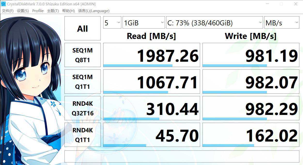通过CrystalDisklnfo查询,冲锋坦克2GL65配备的是一块来自金士顿的1TB固态硬盘,CrystalDiskMark测试成绩为1987MB/s的SEQ1M(Q8T1)读取和981MB/S的SEQ1M(Q8T1)写入,表现符合预期。