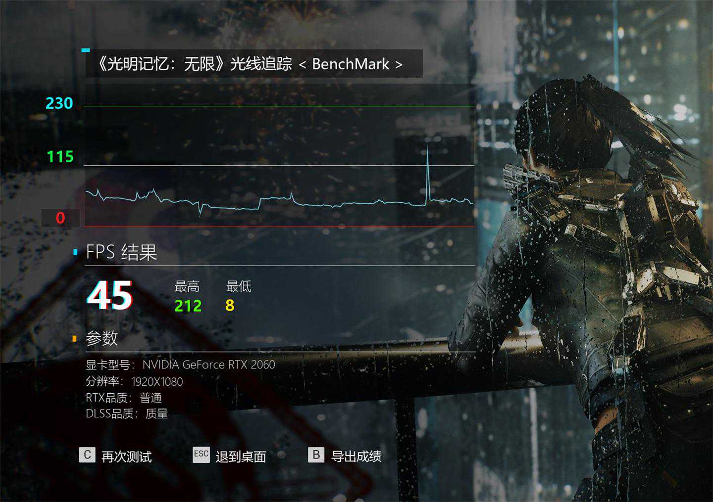 此外,我们还测试了「光明记忆:无限」的光追Demo,在1080P画质下开启普通RTX质量,最终给出的平均帧数成绩为45FPS。