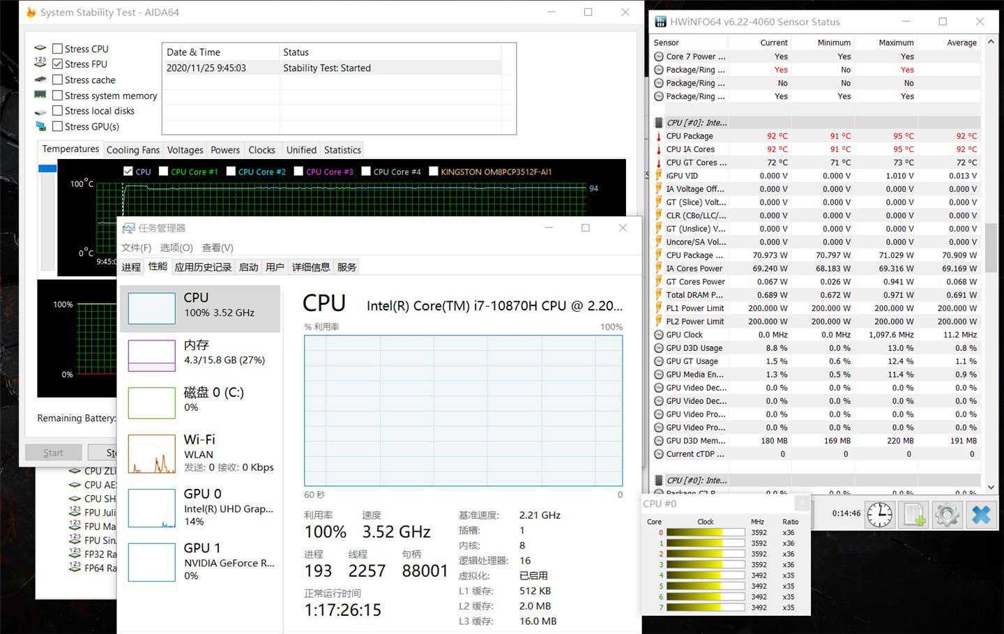首先是单烤30分钟FPU,冲锋坦克2GL65此时的CPU温度保持在92度、功耗保持在70W,CPU主频为3.52Ghz。