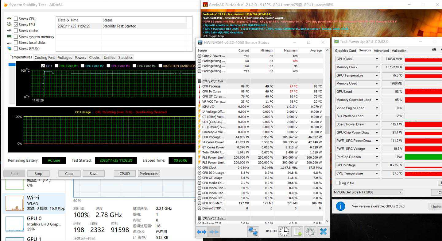 最后是30分钟的双烤FPU和GPU,30分钟后CPU温度为89度,功耗降到了45W,主频2.78Ghz,GPU温度75度,频率为1485MHz,功耗仍保持在115W。虽然CPU功耗略有下降,但对游戏影响其实并不大,在经历了长达30分钟的双考环节中,冲锋坦克2GL65的GPU仍保持了115W的性能输出,这个表现是可圈可点的。