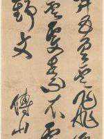 朱耷是清代著名的书画家。他的简笔写意花鸟画,以独特的面貌,开一代新风。他的书法亦与他的绘画风格相似,极为简练,到晚年喜用秃笔,一变锐利的笔势而变成浑圆朴茂的风格。