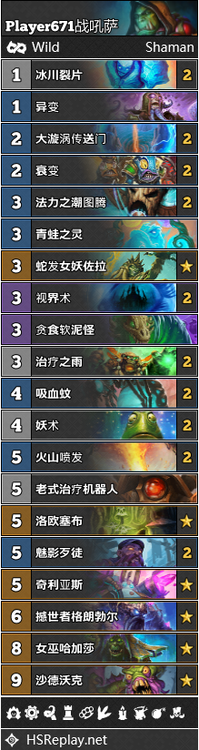 而战吼萨似乎就始终与成功无缘。很少有战吼萨能从低分段一路上爬,因为他的胜率实在是惨不忍睹。不管是组合技变种还是青玉变种都难堪大用,因为不论你玩的是何种套路,战吼萨既无力抵御对手的场面压力,也拼不过其他的慢速卡组。Player671使用下面搬运的构筑参加了狂野公开赛的决赛。
