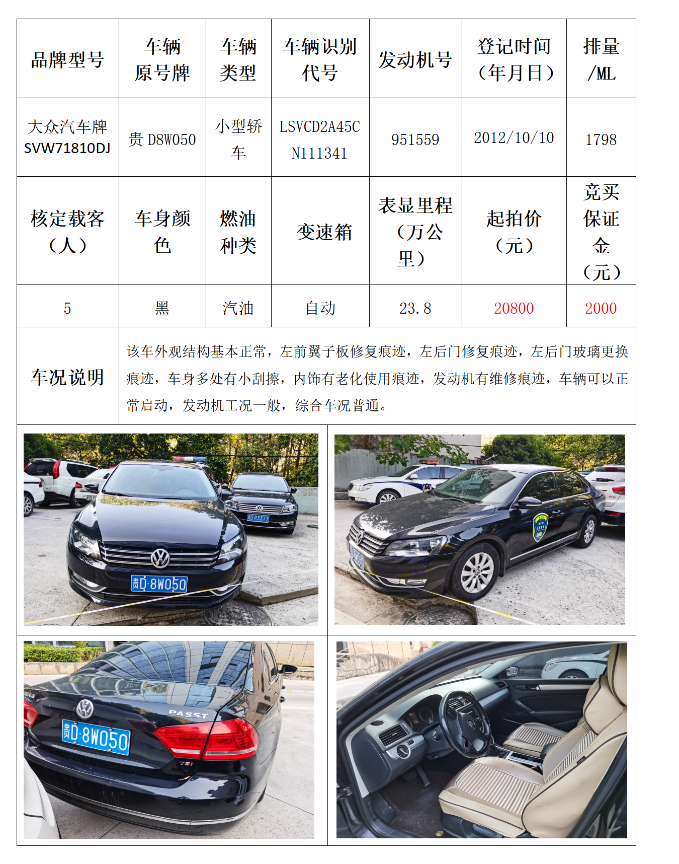 拍品编号5:大众汽车牌SVW71810CJ小型轿车一辆