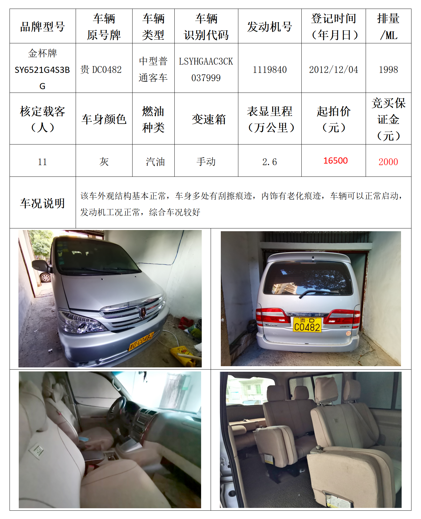 拍品编号11:金杯牌SY6521G4S3BG中型普通客车一辆