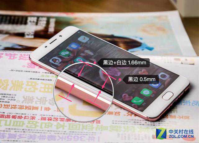 OPPOR7s就曾相比R7做出了缩减边框的努力,R9进一步挖掘了这上面的潜力,将屏幕黑边缩减到了仅有0.5mm,而屏幕到机身边缘(也就是黑边加白边)的距离也从R7的2.5mm、R7s的2.2mm,进一步所见到仅有1.66mm。