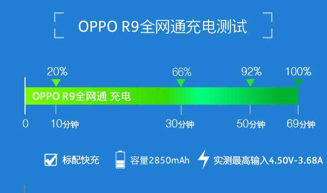 充电方面,OPPOR9依然搭载了自主研发的“VOOC”闪充技术,通过低电压高电流的充电方式来达到快充同时降低发热的效果,依然搭配“5V/4A”输出的充电适配器;VOOC闪充配备定制电池,并在电源适配器中创新性植入微型智能芯片“闪芯”,智能监控,保证大电流平稳安全充入电池,保护电池安全。